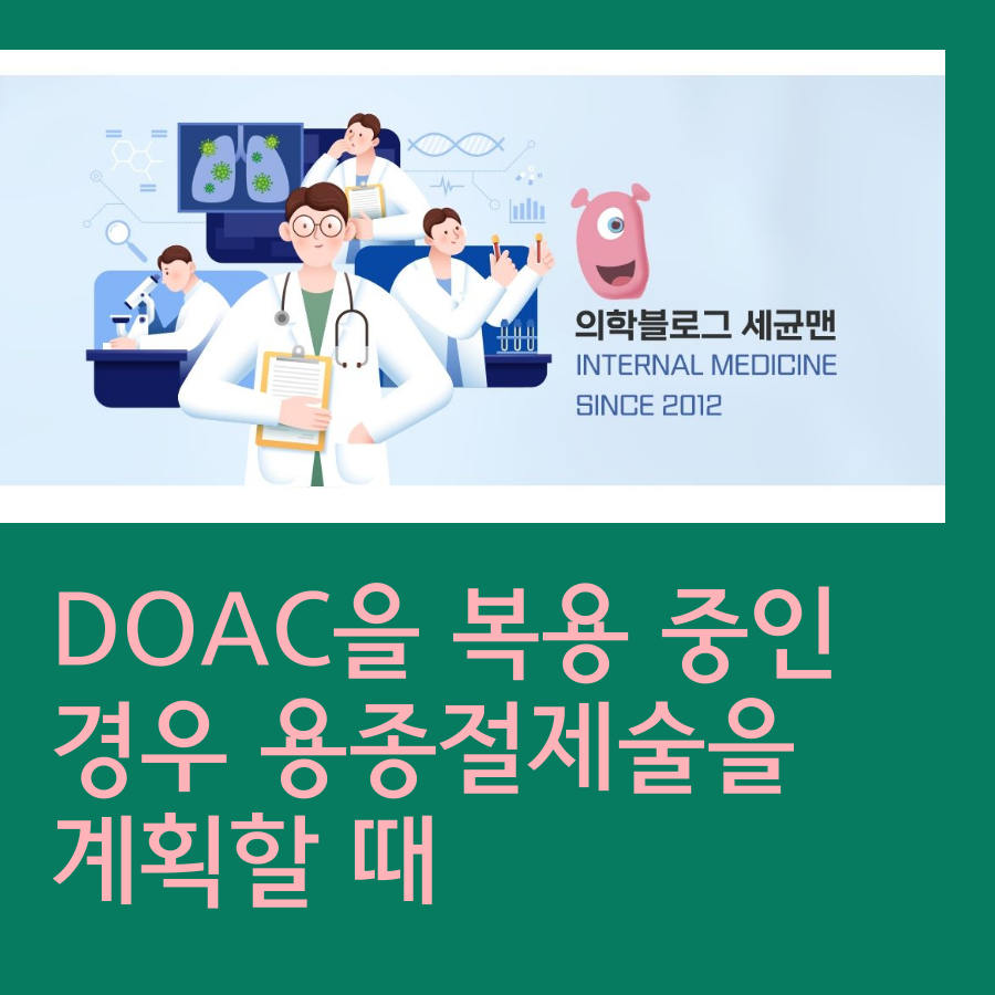 High bleeding risk surgery의 경우 시술 전 2일 동안 DOAC을 중단하고 (약 48시간) 출혈이 없다면 시술 2일 후 (약 48시간) 개시합니다. 총 중단 기간은 4일입니다. 일부의 경우 1일 더 추가로 기다려서 개시하기도 합니다.
