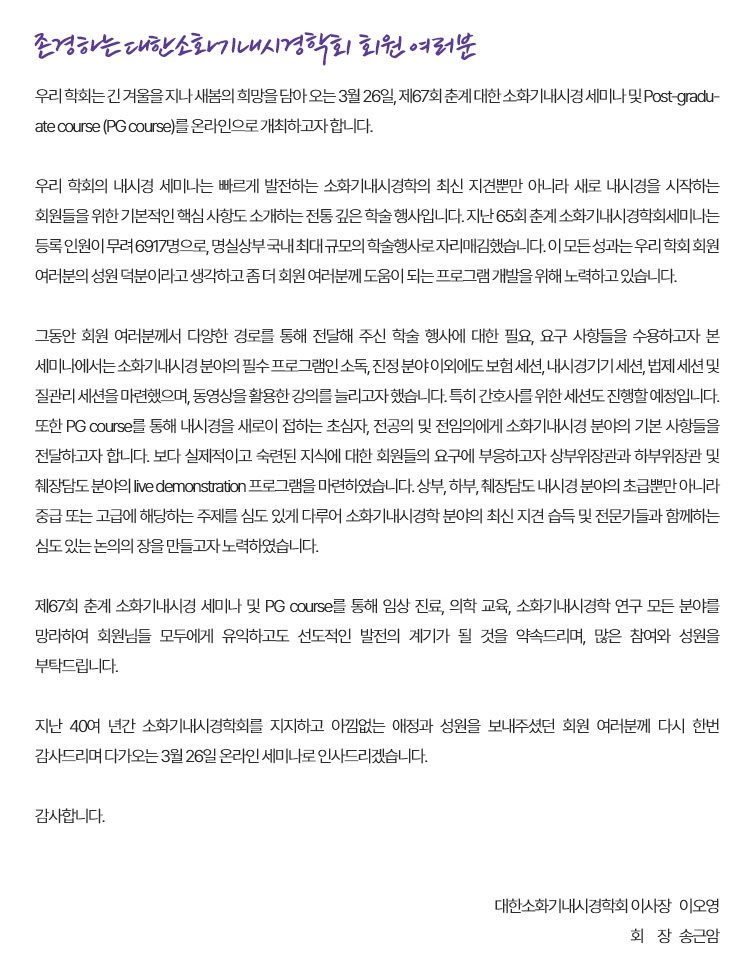 | ●2023.02.02● 제4회 대한소화기내시경학회·대한소화기학회 경기·인천지회 합동 연수강좌 (0) | 2023.02.02 |