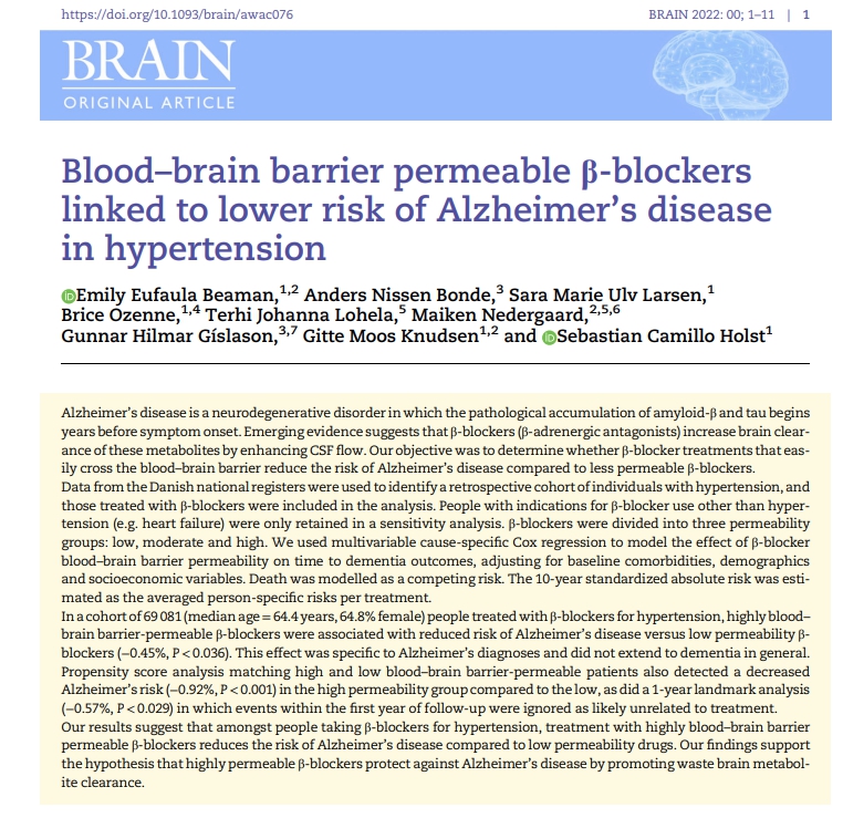 고혈압 환자가 낮은 BBB 투과성 베타차단제와 비교하여 높은 BBB 투과성 베타차단제를 복용할 경우 알츠하이머병 위험이 낮았다.