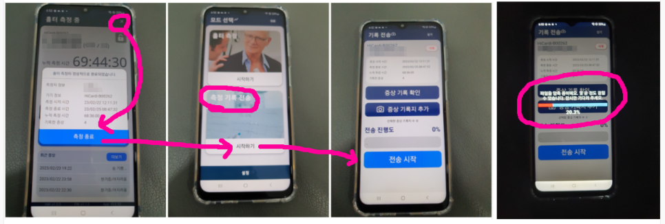 하이카디 스마트폰에서 X표를 누르기 → 측정 종료 → 측정기록 전송 (시작하기) → 전송시작