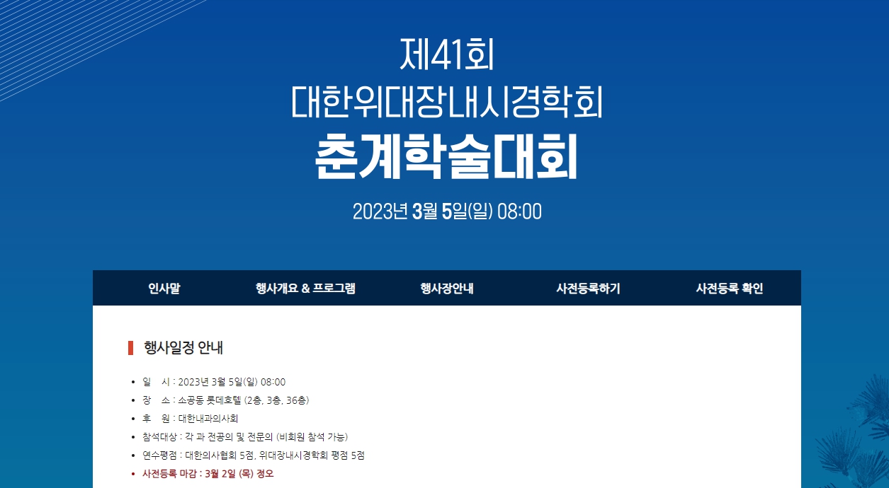 | [2023.03.05] 제41회 대한위대장내시경학회 춘계학술대회 (0) | 2023.03.01 |