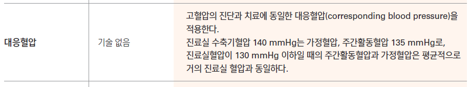 고혈압의 진단과 치료에 동일한 대응혈압 (corresponding blood pressure)를 적용한다 <표 8>. 진료실혈압이 130 mmHg 이하일 때의 주간활동혈압과 가정혈압은 평균적으로 거의 동일하다. 그러나 개별 환자에서는 130 mmHg 이하의 진료실혈압에 대해서도 백의 효과와 가면효과 여부를 확인하는 것은 여전히 중요하다.