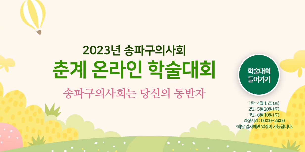 | 사전등록 ~04.12 송파구의사회 춘계 온라인 학술대회 (0) | 2023.04.12 |
