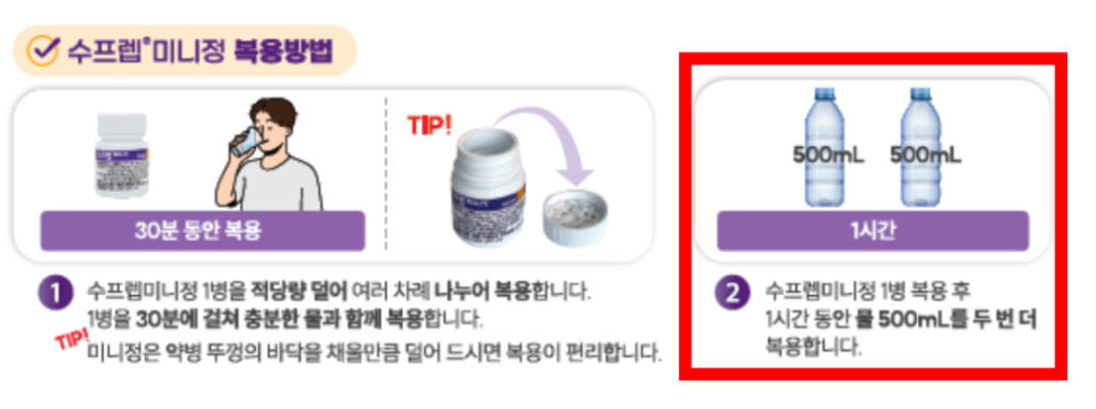 - 검사 전날 물 한 컵을 먼저 마시고, 수프렙미니정 1병에 있는 알약을 모두 삼키는데 물 500 mL, 이후 1시간 동안 물 1L를 마십니다 (물 한컵 + 1.5L)