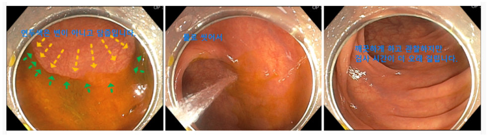 마지막 물 복용은 검사 2시간 전까지 완료해야 합니다. 또한 당일 검사 5-6시간 전에 너무 일찍 약을 마시면 아래 사진처럼 정결이 된 대장 점막에 담즙이 도포되어 씻어서 관찰해야 하므로 검사 시간이 오래 걸립니다.
