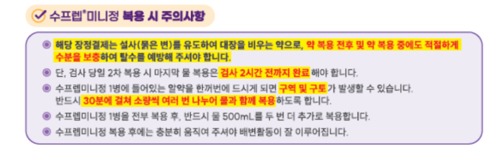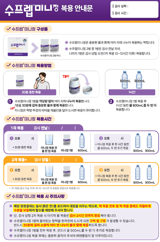 수프렙미니정은 충분한 물과 함께 여러 차례 나누어 복용합니다. 1병은 검사 전날 저녁, 나머지 1병은 검사 당일 오전 (또는 새벽)에 복용합니다.
