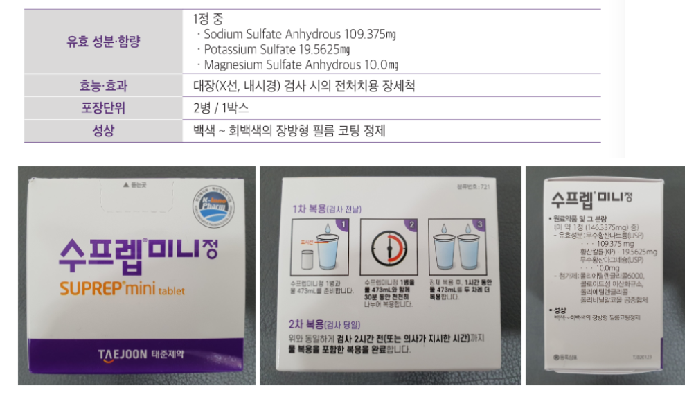 수프렙액과 수프렙미니정의 내용물 함량을 비교해 보면 《수프렙액》은 총 2병 (1병 함량 X2)이므로 무수황산마그네슘 3.2 g, 무수황산나트륨 35g, 황산칼륨 6.26 g이며 《수프렙미니정》은 총 320정 (1정 함량 X 320)이므로 무수황산마그네슘 3.2 g, 무수황산나트륨 35g, 황산칼륨 6.26 g으로서 총 복용하는 주된 내용물 전체 함량은 일치합니다. 수프렙액을 첨가제를 이용하여 정제로 변환한 것입니다.