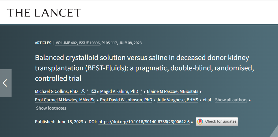 신이식 수혜자에서 IV 수액은 수술 전후 체액 유지와 graft function을 최적화 하기 위해 일상적으로 투여됩니다. 비록 0.9% normal saline이 널리 사용되지만 이것은 hyperchloremia, metabolic acidosis, renal vasoconstriction, 감소된 GFR, kidney injury와 관련이 있습니다. 800명 이상의 deceased-donor kidney transplant recipients를 포함한 무작위 시험에서 balanced low-chloride crystalloid solution은 normal saline과 비교하여 delayed graft function (need for dialysis within seven days after transplantation)의 발생률을 줄였습니다 (30% 대 40%).