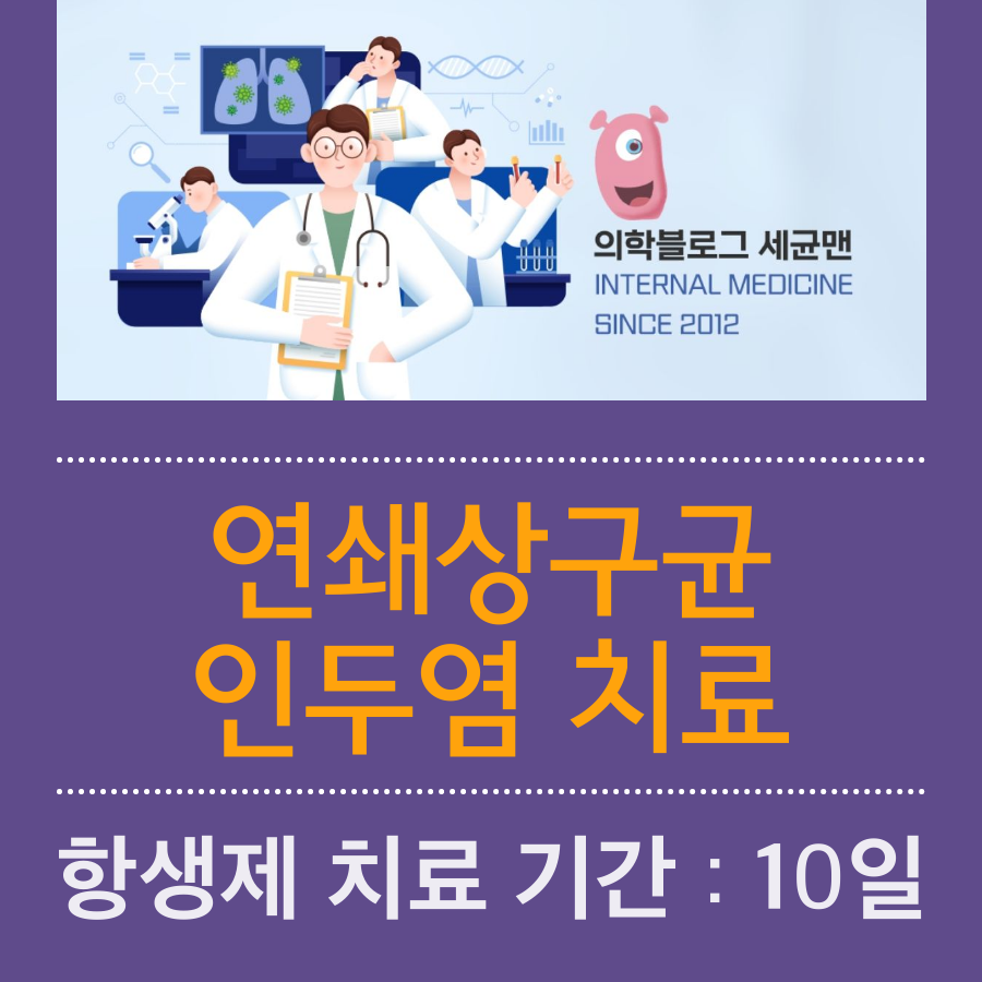 - 아주 초기에 방문하여 일찍 항생제를 치료한 경우 5-7일 사용하고 인두의 삼출물도 아주 깨끗하게 되고 증상도 완전 호전이 되어 일률적으로 10일을 적용하는 것에 대한 ?가 있지만,