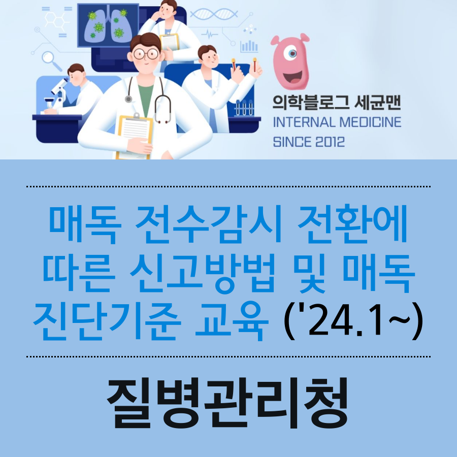 『감염병의 예방 및 관리에 관한 법률』개정에 따라 '24년 1월 1일부터 매독이 4급 감염병에서 3급 감염병으로 전환되어 모든 의료기관에 신고의무가 부과되고 (전수감시), 신고 대상 매독 병기 또한 현행 3종에서 5종(1기, 2기, 3기, 선천성, 조기 잠복매독)으로 늘어나게 됩니다.
