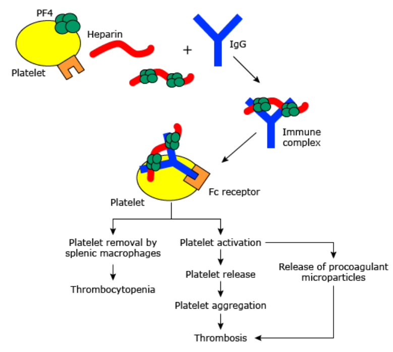 - 먼저 헤파린을 투여하면 헤파린과 PF4 (Platelet factor 4) 가 결합하여 Heparin-PF4 복합체를 형성하게 됩니다. 그런데, 일부 환자에서는 이 복합체에 대한 자가항체 (HIT-IgG Ab)가 형성됩니다. 이 복합체는 자가항체 (IgG)에 결합하게 되고, 이때 IgG 의 Fc 부위가 혈소판의 Fc 부위와 결합하여 혈소판의 활성화를 일으킵니다. 이는 혈소판 응집과 혈전 생성을 유도하며, 이렇게 응집된 혈소판들이 비장에서 제거되어 혈소판 수치가 감소하게 됩니다.
