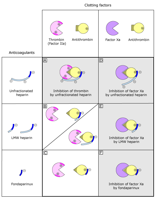Schematic representation of anticoagulant mechanisms. Heparins bind to antithrombin (AT) and induce a conformational change that makes AT an efficient inactivator of coagulation factors. Unfractionated heparin inhibits thrombin (factor IIa) by forming a ternary complex. The inhibitory effect of LMW heparins on thrombin is variable, with longer products such as tinzaparin having greater inhibition than the shorter products such as enoxaparin. All heparins and fondaparinux efficiently inactivate factor Xa. Refer to UpToDate topics on use of heparins and fondaparinux for details.