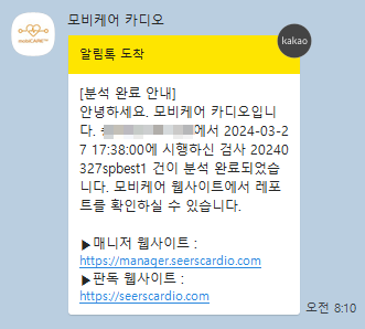 6. 분석이 완료되면 카톡 메시지가 오고 모비케어™+카디오 (seerscardio.com)에서 'completed' 되었음을 확인할 수 있습니다.