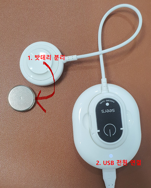 2. 회수한 모비케어의 밧데리를 분리하고 전원을 컴퓨터 USB 단자에 연결합니다.