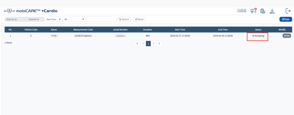 5. 자동으로 분석에 들어갑니다. 모비케어™+카디오 (seerscardio.com) 에서 상태를 확인해 보면 recording에서 analyzing으로 바뀌어 있음을 알 수 있습니다.