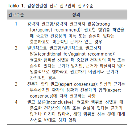 본 진료 권고안은 크게 고위험군에 대한 갑상선암 선별검사, 임상적 혹은 우연히 발견된 갑상선결절의 적절한 검사법, 갑상선결절의 진단에 있어 병리진단검사 및 분자표지자검사의 역할, 갑상선결절의 장기 추적관찰, 갑상선 양성 결절의 치료, 임신부의 갑상선결절의 6가지 부문으로 구성되어 있다. 각 부문에서 중요한 내용들은 권고 사항으로 기술하였으며 각 권고 사항에 대한 권고수준은 Table 1과 같다. 본 개정안에서 변경된 주요 내용은 1) 갑상선암 선별검사가 권고되는 고위험군의 정의, 2) 갑상선결절의 진단을 위한 개정된 K-TIRADS의 적용, 3) 중심바늘생검 및 분자표지자검사의 역할 추가, 4) 저위험군 미세갑상선유두암에서의 적극적 관찰의 적용, 5) 양성 갑상선결절에 대한 비수술적 치료의 보다 구체화된 적응증에 대한 것이다.