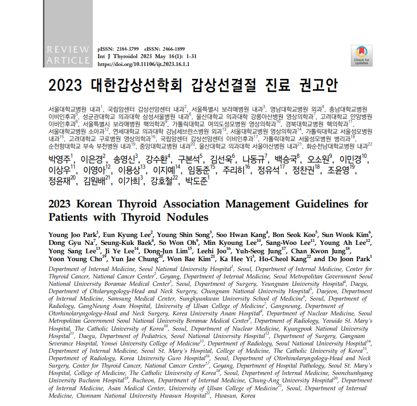 | 새로운 권고안(2021 Korean Thyroid Imaging Reporting and Data System)을 이용한 갑상선 결절의 평가 : 대한내과학회지 2022 (2) | 2023.01.24 |