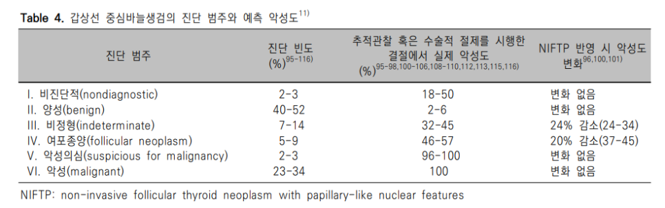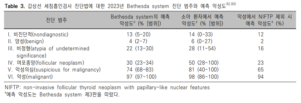 FNA의 결과는 “The Bethesda System for Reporting Thyroid Cytopathology”에 따라 6개 범주로 보고한다. Bethesda system은 2010년 제1판,90) 2018년 제2판으로 출판되었으며,91) 2023년 제3판으로 개정된다.