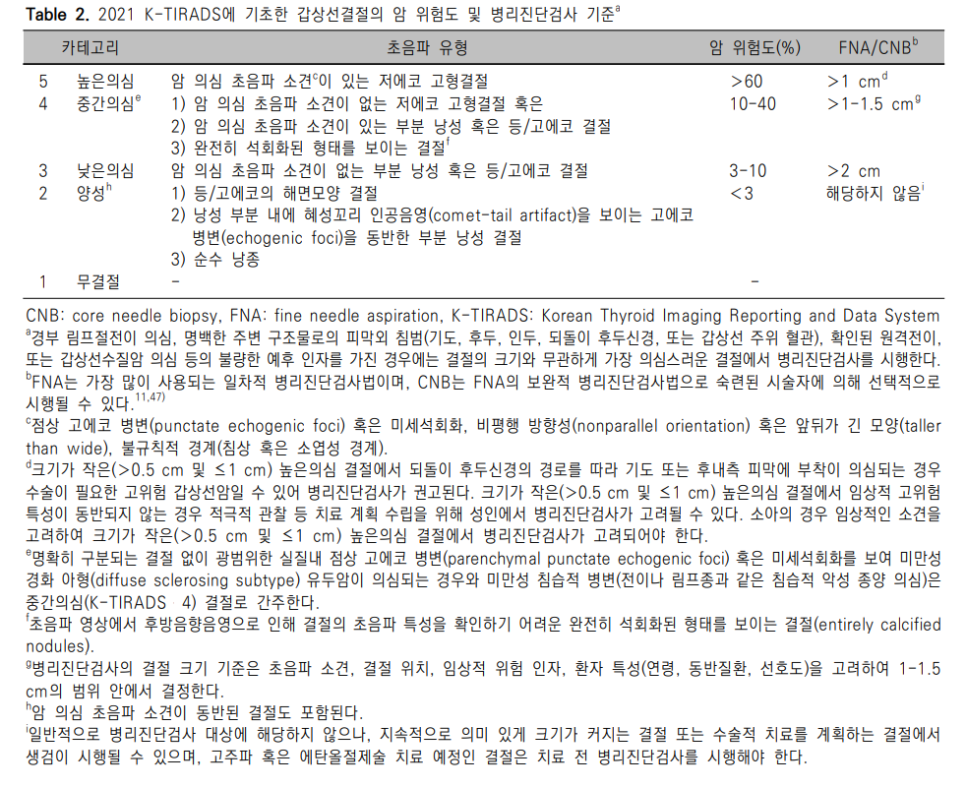 이상의 초음파 소견에 기반하여 2021년 대한갑상선영상의학회에서 개정한 갑상선결절의 악성 위험도 분류체계(K-TIRADS)에서는 갑상선결절을 초음파 유형에 따라서 갑상선암 높은의심(high suspicion), 중간의심(intermediate suspicion), 낮은의심(low suspicion), 양성(benign)으로 분류하였다(Table 2).12,87)