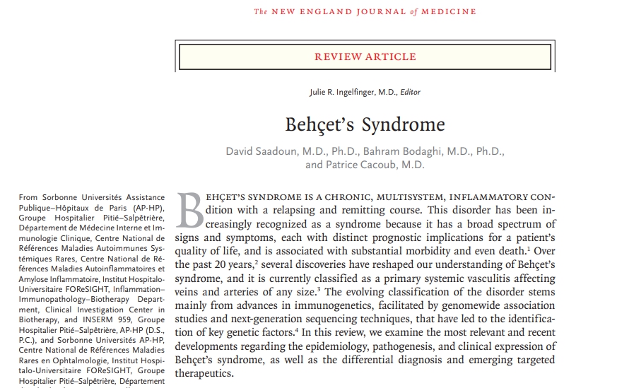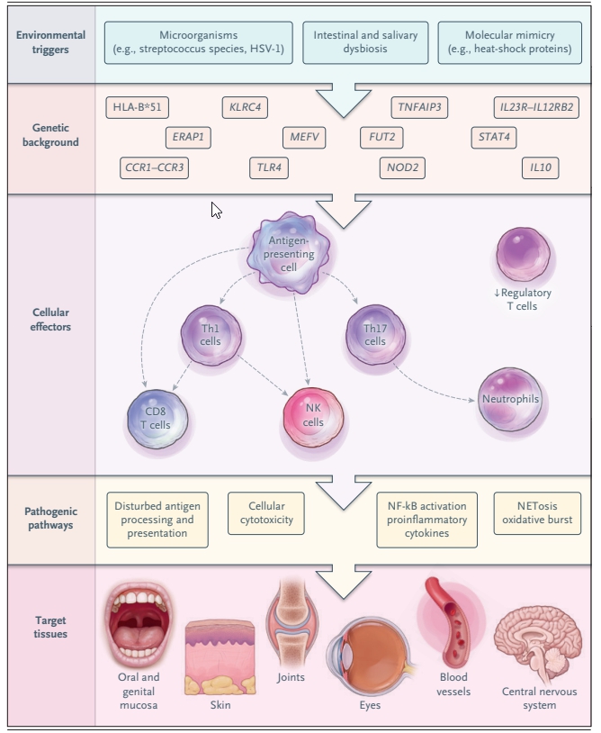 베체트병은 신체의 여러 부위를 침범하는 (multisystem), 만성적인 (chronic) 염증 질환이며, 재발 및 관해를 보이는 것이 특징입니다.