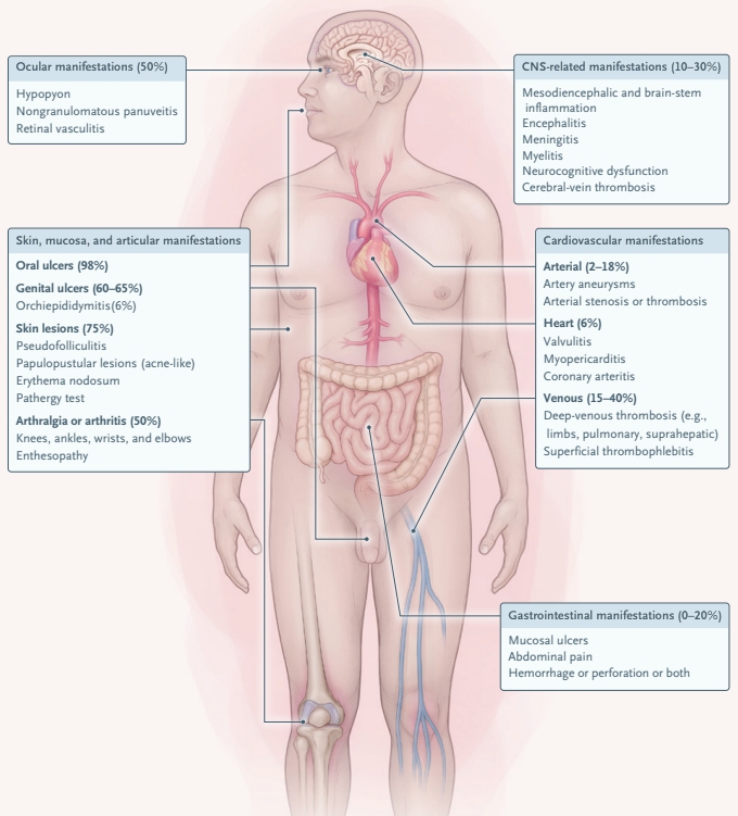 베체트병의 증상은 침범하는 신체 계통에 따라 분류될 수 있으며, 주로 침범되는 곳은 피부, 점막, 관절, 눈, 혈관계, 중추 신경계, 그리고 소화 기관입니다.
