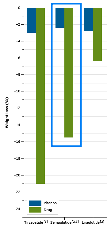 제2형 당뇨병이 없는 성인 1,961명을 대상으로 68주 동안 진행된 이 연구에서, 세마글루타이드 투여군은 위약군 대비 평균 체중 감소가 -15.3kg로 위약군(-2.6kg)보다 더 컸습니다(95% CI -13.7 ~ -11.7).
