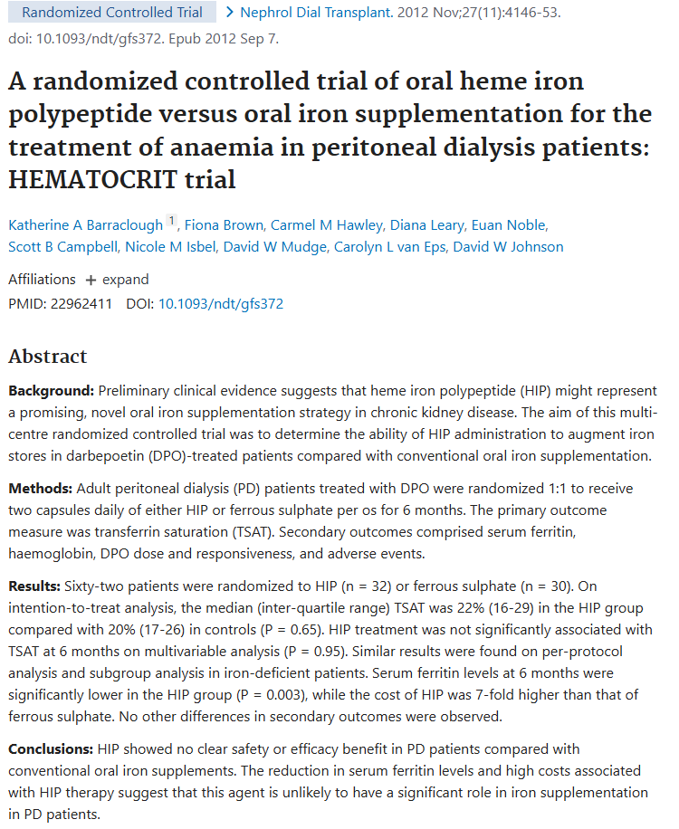 보충제(서플리먼트) 관점에서 헴 철이 더 잘 맞는다는 마케팅 문구가 있지만, 임상적 우월성을 일관되게 입증한 근거는 부족하다. 대표적으로 투석 전 자극호르몬 치료 중인 복막투석 환자에서 시행한 무작위시험은 헴 철 폴리펩타이드(HIP)가 ferrous sulfate에 비열등하지 못했고, 비용 부담도 컸다고 결론지었다. 비투석 CKD 환자 연구에서는 HIP가 헤모글로빈 유지는 비슷하지만 페리틴 보충에서는 IV iron sucrose에 열등했다. 종합하면 특정 상황에서의 대안이 될 여지는 있으나, 표준 경구 ferrous 염을 일괄적으로 대체할 만큼의 일관된 우위는 확인되지 않았다.