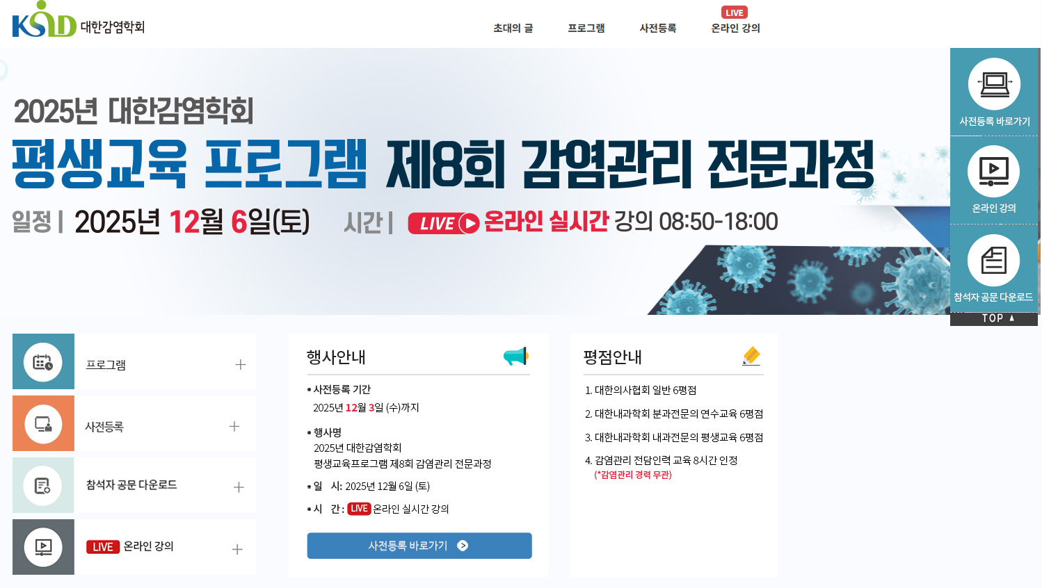 | 2025.12.12~13. 제23회 내과전공의 핵심역량 연수강좌 사전등록 (외부학술회의 최대 4점 부여) (0) | 2025.11.12 |