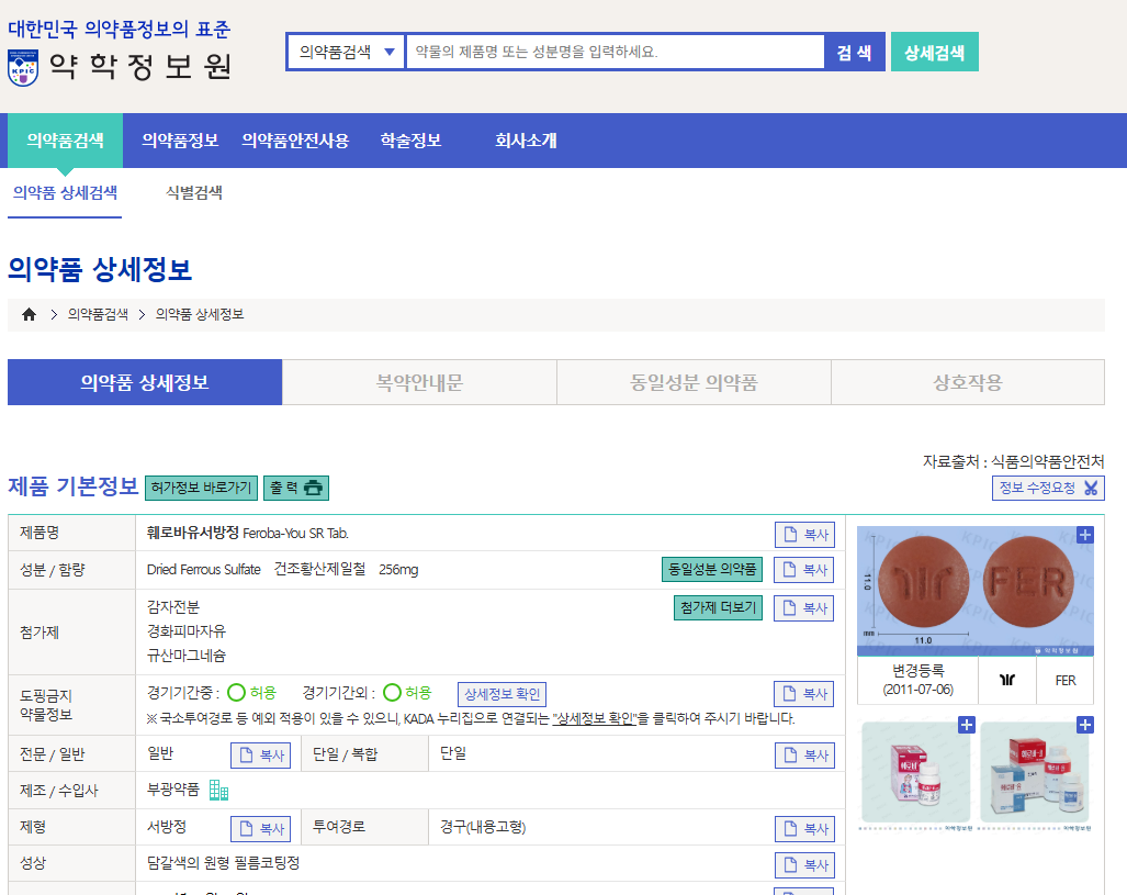 훼로바유서방정은 ferrous sulfate입니다. 상병만 넣으면 되고 가격도 싸서 외래에서 자주 처방하는 약제입니다. 그래서 그런지 다른 철분제들이 부작용이 더 적을 것 같고 훼로바유서방정은 더 있을 것 같은 생각이 듭니다.