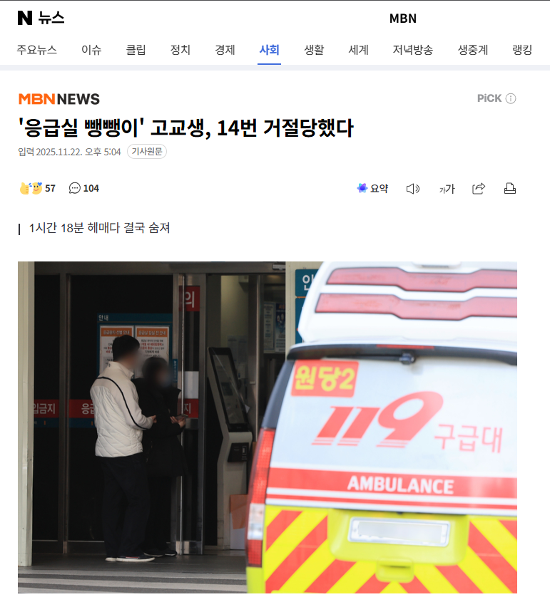 응급실 뺑뺑이에 대한 기사가 오늘 인터넷 뉴스 헤드라인에서 보이네요.