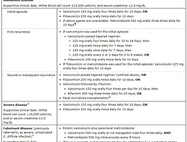 경구 vancomycin(125 mg 하루 4회)이 중증 환자에게 즉각적으로 투여되어야 합니다. 자료에 따르면 표준 용량 (125 mg 하루 4회)으로 도달되는 약물 농도는 고용량(500 mg 하루 4회)으로 도달되는 용량과 비슷합니다. 일부 임상가는 severe disease에서는 고용량을 선호합니다. 그러나 이것을 지지하는 좋은 증거는 없습니다.
