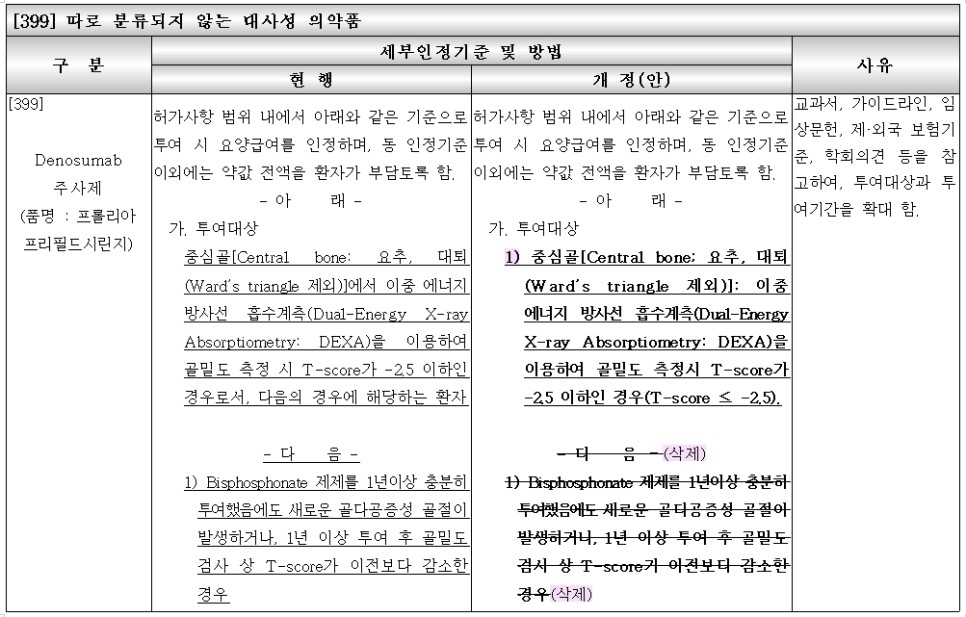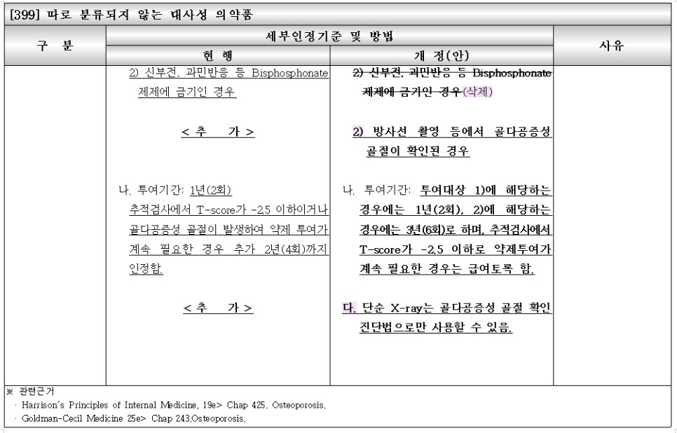 신규 등재 예정인 골다공증치료제로 교과서, 가이드라인, 제외국 평가결과 등을 참조하여 투여대상을 설정하였으며, 관련 약제 급여기준 등을 참고하여 투여기간을 명시함.