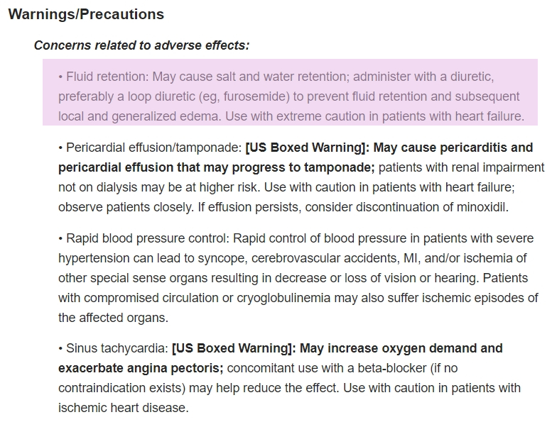 미녹시딜(minoxidil)은 염분 및 수분 저류를 일으킬 수 있어서 체액 저류와 연이은 국소 및 전신 부종을 예방하기 위해 이뇨제, 바람직하게는 루프 이뇨제(예 : 퓨로세마이드)를 투여합니다. 그리고 심부전 환자에게 각별히 주의해야 합니다.
