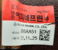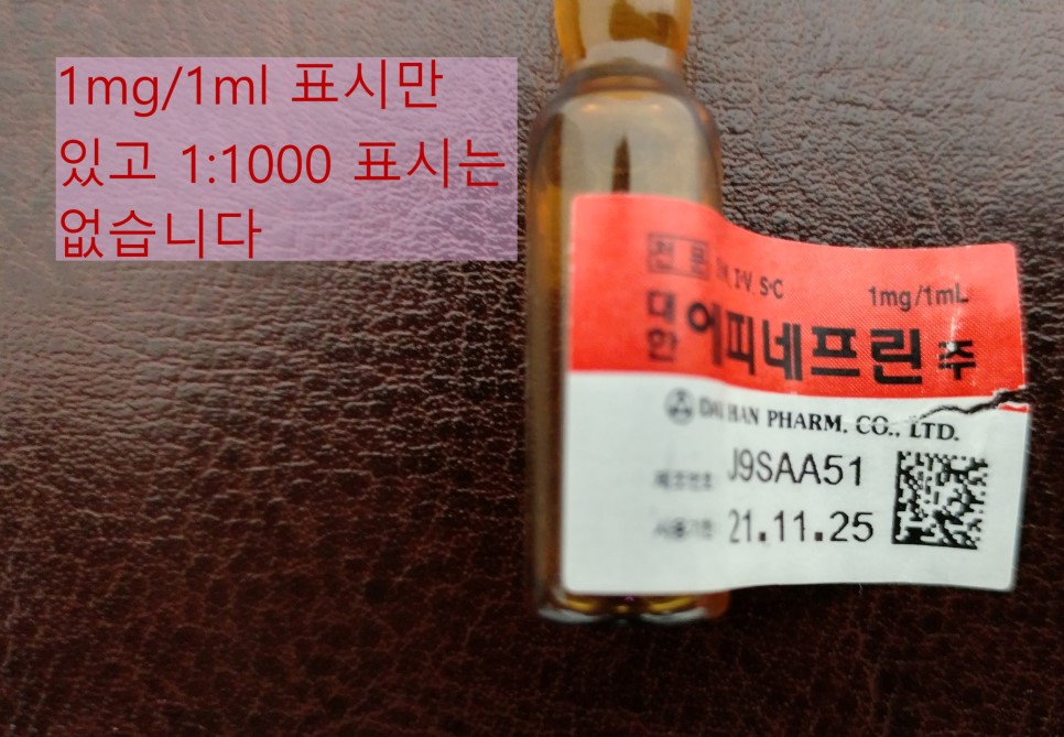 근육주사를 위한 에피네프린은 1 mg/mL을 포함하고 있습니다. 앰플에는 또한 1:1000이라고 써 있기도 하는데, medication errors를 예방하기 위해 이와 같이 비율로 표현하는 것은 미국에서 label에서 없어졌습니다. 오직 mL당 포함된 양으로만 표시됩니다. 그러고 보니 원내에 들여 놓은 에피네프린 주사도 1mg/1mL만 표시되어 있습니다.