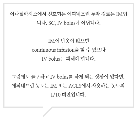 2. 아나필락시스에서 에피네프린 IV 주사를 하게 되는 상황은 되도록 피하지만, 꼭 필요하다면 아나필락시스 IM 주사 용량 또는 ACLS IV 주사 용량의 1/10을 사용합니다. 그리고 천천히 주사해야 합니다.
